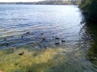 Перспективные места озера возле затопленных кустов заняты с самого утра, хотя где именно будет брать карась, никто заранее угадать не сможет. Кто-то проверяет траву, другие плывут на чистую воду.
