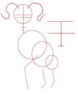 Вы нарисуйте короткий прямую линию для шеи а затем еще три круга для его туловища, живота и торца. Добавить линии для конечностей, а также две вертикальные линии и одну горизонтальную линию для глифа.