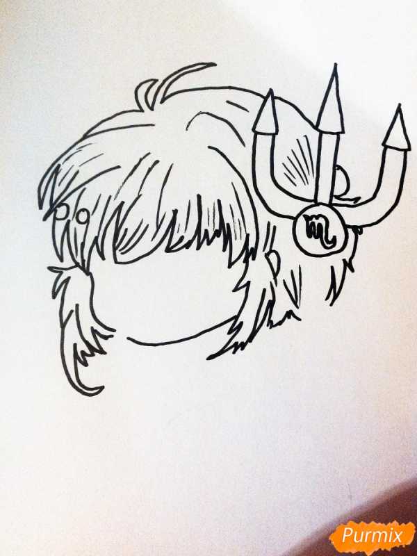 Рисуем голову и волосы, оставляя места как показано на рисунке.