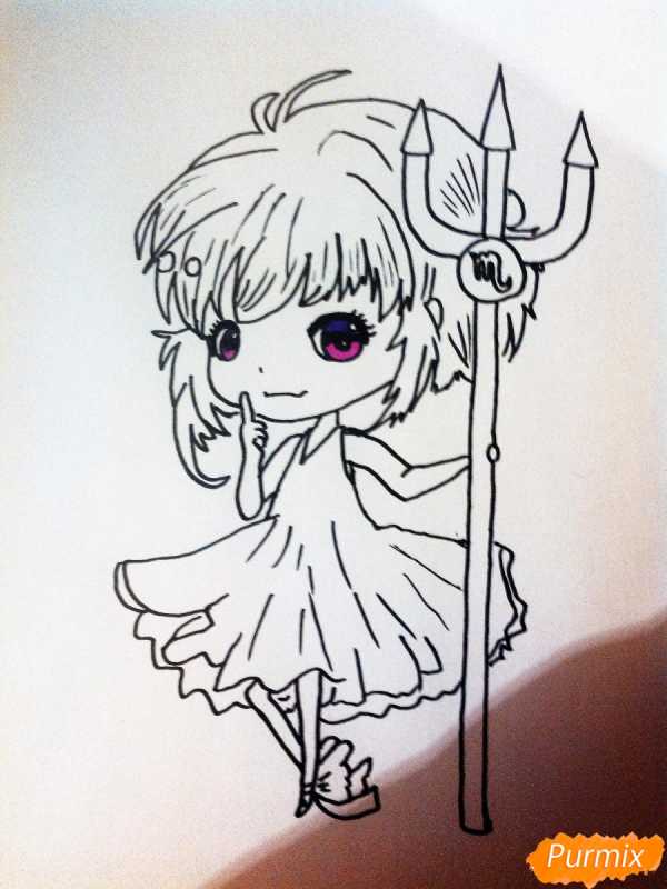 Рисуем руки, детализируем лицо, так-же рисуем трезубец.
