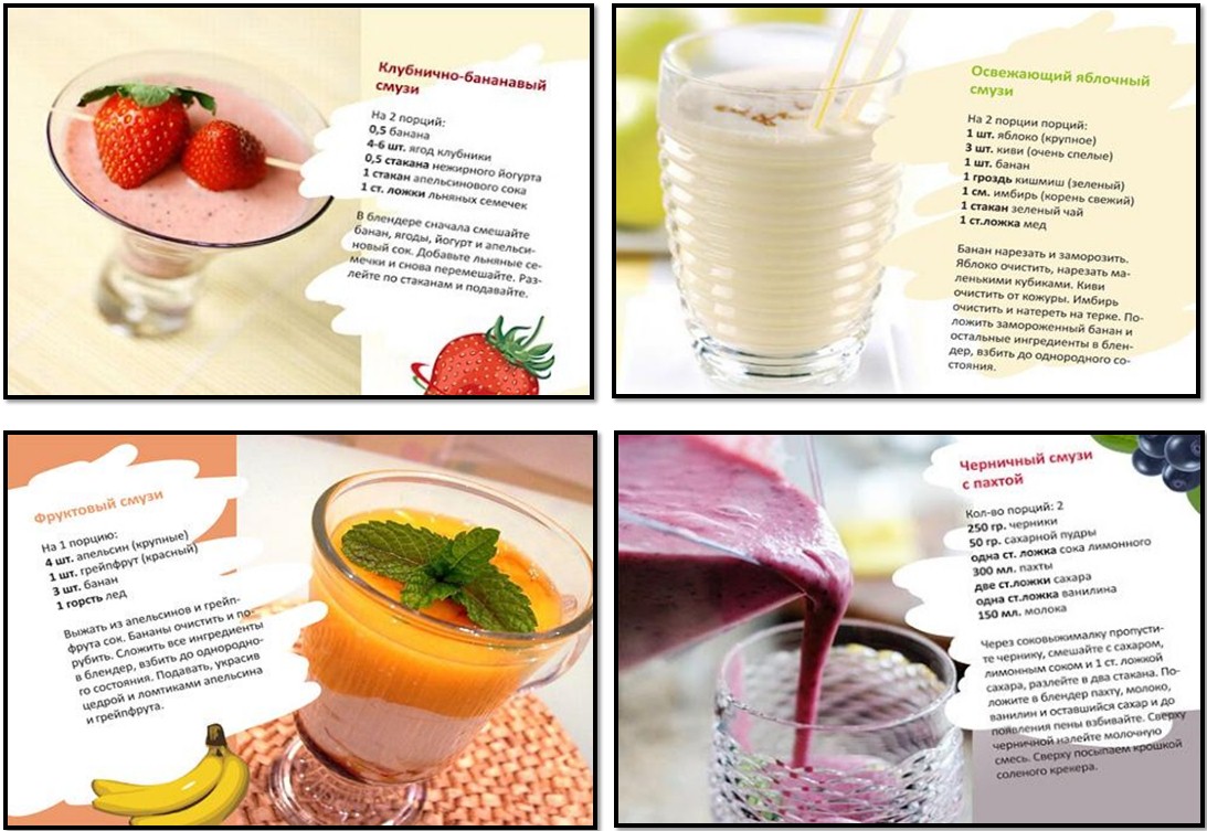 Самым ходовым питьевым блюдом в этот период (после воды) для Вас должны стать смузи. Это напиток, приготовленный в блендере из смеси ягод/фруктов, молока/сока и льда. Всем известно, что барышни -большие выдумщицы в постели на кухне. Они не любят съесть просто банан или апельсин, я это учел и представляю их(Вашему) женскому вниманию следующие рецепты смузи.