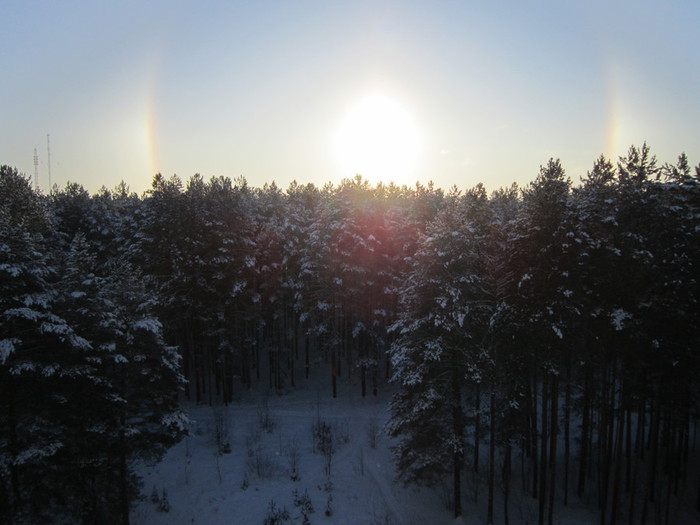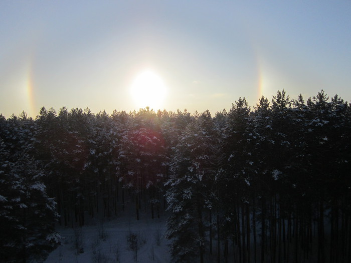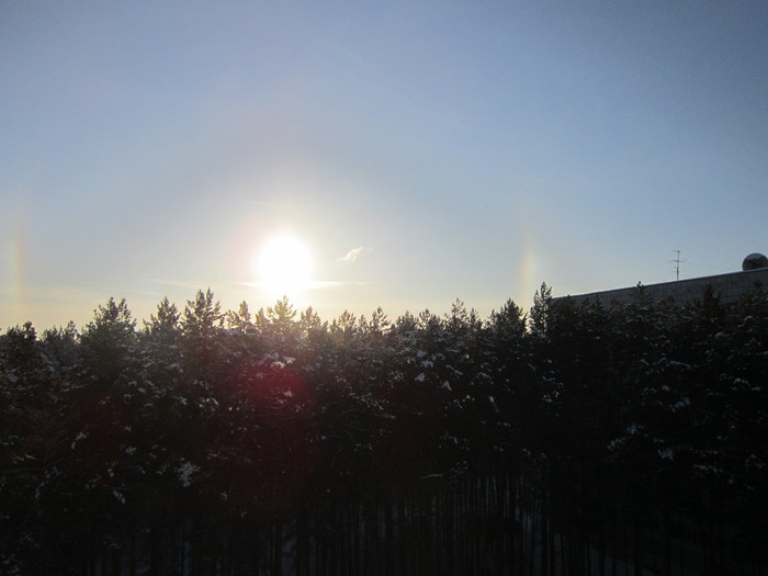 Чаще всего зимнее гало – это ореол вокруг солнца или луны. Влажность возникает из-за того, что атмосфера насыщена огромным количеством ледяных кристаллов, и солнечные лучи, проходя сквозь них, преломляются, образуя с внутренней стороны гало свечение красноватого цвета. В очень редких случаях свечение состоит из полного спектра цветов (как это и было сегодня!).