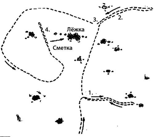Разобраться во всех этих уловках не так-то просто, особенно если, идя по следу зайца мы затоптали его следы. Поэтому идти нужно всегда немного в стороне от следа и при этом не забывая посматривать по сторонам: тот, кто не отрывает взгляда от отпечатков заячьих лапок, почти всегда прозевает подъем зайца. Заяц очень часто, сделав петлю, возвращается туда, где он прошел раньше, и устраивается на лежку поблизости от своего следа. Охотник видит уходящую вперед линию следа и думает, что до лежки еще далеко, а заяц уже рядом, наблюдает за своим преследователем и, пропустив его, убегает незамеченным. Так что любое местечко вблизи следа, подходящее для заячьего укрытия, должно быть объектом неусыпного внимания. Дойдя до места заячьей жировки, где следы переплетаются в неразборчивый клубок, нет ни малейшего смысла разбирать и выхаживать все эти переплеты. Гораздо лучше просто обойти жировку по кругу, найти выходной след и уже по нему продолжать тропление. Это значительно сократит время охоты.