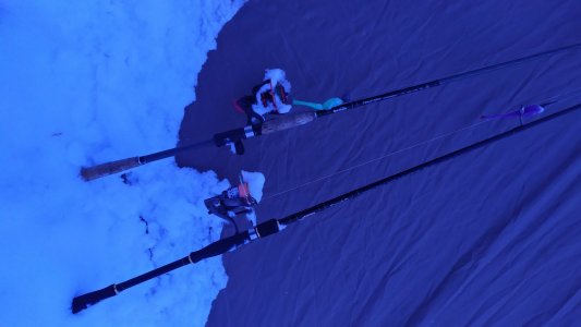 Примерно к расвету (к 8-9 часам) мы добрались до водоема и первым делом проверили лед. Лед трещит, у берега он даже сразу провалился, пришлось искать доску что бы выйти на лед. Дальше он уже более менее держал, но подходить друг к другу ближе чем на 5 метров было всеравно опасно. Местами он так же трещал, даже когда шел один. Колян чуть тяжелее меня и он под ним трещал постоянно в течении всех 3 дней рыбалки =)