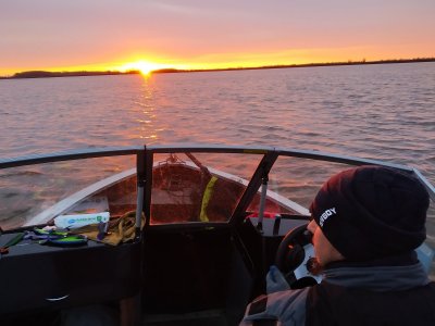 Протока на которую я возлагал большие надежды ничего нам не дала , и мы полезли в коряжник. Где мне посчастливилось ощутить пару поклевок крупной щуки и даже подержать ее немного. А потом, с этой же точки из под берега я ловлю рекордного для себя окуня весом 1кг 55гр. Последующие точки и постановки либо ничего нам не приносили либо давали килошек. Время неумолимо близилось к вечеру и было принято решение двигать в сторону лагеря и пытаться поймать судака на закате. Но до судаков мы не доехали совсем чуть чуть, решив сделать по пару забросов на песках, рядом с лагерем. Встали на 4м и начали чесать сектор. Каждый заброс в сторону берега я ощущал присутствие какой то стаи рыбы , постоянно были контакты и вершинка спиннинга просто сходила с ума. А потом произошло, что то несусветное, напарник почти с каждого заброса начал ловить щук от 1.5 до 3кг и за каких то 20минут выдернул 6 шт. Я же успел взять только одну. Щука клевала даже в темноте. А потом клев резко выключили и мы поехали в лагерь. Поужинав супчиком с тушеночкой мы крепко уснули.