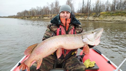 Едем опять вниз по течению, мне ни как не давала покоя та щука в коряжнике которая сошла, было ощущение чего то недоделанного. Хотелось, во что бы то не стало ее доловить. Но до неё мы не доехали . Бывает такое у меня, меня куда-то тянет как магнитом , так и тут я меняю курс и еду к одной из вчерашних точек, где мы стояли, но встали тогда мы не правильно. Заехав туда и опустив якорь, я понял, что место просто шедевральное, канава под берегом отделенная двумя косами поперечной которая отбивает все течение и продольная которая служит местом кормёжки . Свал с 2 на 6 . Встаём в самой яме практически по середине, я не меняя приманки делаю заброс под 45 градусов в берег. 24гр и тиога 3.9" на двойнике отчётливо стучат по дну, пятая ступенька и лёгкий тюк. Подсекаю и понимаю, что на том конце, что то приличное , оно медленно мотает головой из стороны в сторону пытаясь избавится от приманки и я слышу как струна скачет по зубам этой рыбы . Место чистое и я ослабляю фрикцион на сколько это возможно. Рыба идёт почти без рывков , словно я тащу упрямого бычка за верёвочку. Палка 2.74 отрабатывает все рывки не давая ей слабины, длинна позволяет. Рыба у лодки, начинаю плавно поднимать и она неспеша всплывает. Что во мне творилось в тот момент сказать сложно, но я увидел то за чем гоняюсь уже пять лет. Огромная щука показала нам свою гигантскую голову и махнув красно оранжевым хвостом снова скрылась в глубине. Это она, наконец то она, сбылась моя мечта, кричало что то у меня в груди. Сейчас главное все сделать правильно. Подвожу ее ближе к лодке напарник опускает ковш здоровенного подсака в вводу и я начинаю ее в него заводить . Щука заходит на половину изгибается всем телом и встаёт. Я вижу, что Саша вытянулся во всю длину своего тела и не может дальше продвинуть подсак , сердце мое почти остановилось. Но потянув сильнее затягиваю ее дальше и она проваливается в ковш. От радости я чуть не выпрыгиваю с лодки, беру подсак за ковш и закидываю ее в лодку. Ураааа. Ору я на всю Обь!