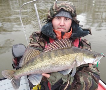 Кидали мы на этого судака всё, что было. Перепробовали все размеры, цвета, веса, высоту подрыва, длину паузы, углы подачи.. Поклевок нет. А судак есть, даже на стоячей лодке боковой обзор показывает, что мимо регулярно кто-то проплывает. Решили пообедать, вдруг рыба чувствует голод? А сытого рыбака она не воспримет как угрозу. Ставим плитку, кипятим, завариваем доширак. Слава опускает свой джиг на дно под лодку, подматывает, чтобы он висел сантиметров 15 над дном, и начинает обед. А параллельно рассказывает, что летом он вот так вот на крупную резину ловил щук. После этой фразы он без всяких предупреждений с размаху выплескивает весь свой доширак мне прямо в борт лодки! А борт обшит карпетом! Да и спиннинги там лежат. Я даже не знаю как реагировать на такую выходку, спрашиваю, Слава, ты охренел? А он с полным ртом что-то мычит и показывает руками себе за спину. И тут я понимаю в чем дело - славин спиннинг весь в воде, торчит над лодкой только рукоять, а висит он, зацепившись катушкой за транец!! Я подскакиваю, перепрыгиваю через Славу, хватаю спиннинг. Там ужасные рывки! Ослабляю фрикцион. Тут Слава такой, дай мне, я вытащу. Не дам! Мой борт от доширака, я сам справлюсь. Рыба на коротке, давит на дно, зверски мотает башкой. Ослабляю на всякий фрикцион и начинаю поднимает. Всплывает судачище, роскошного золотого цвета. Быстро упаковываем его в подсак. Да уж, многое я видел, но такого способа ловли еще не видел! Но самое то интересное, это то, что Слава весь день так и ловил. Один спиннинг по честному кидал и ловил джигом, а на втором спускал глубинный воблер, воблер под действием течения сам заглублялся и висел играл где-то у дна, и раз в 30-40 минут на него сам вешался судак 2-2.кг весом! Короче обловил он меня в тот день по полной, пусть и не совсем спортивно.