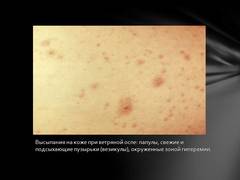 Слайд 9 Высыпания на коже при ветряной оспе: папулы, свежие и подсыхающие пузырьки (везикулы), окруженные зоной гиперемии.