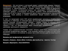 Слайд 14 Вакцинация : Все доступные в настоящий момент коммерческие вакцины содержат ослабленный живой вирус штамма Oka. Многочисленные вариации этого штамма опробованы и зарегистрированы в Японии, Южной Корее, США и нескольких европейских странах. Оптимальный возраст для вакцинации - 12-24 мес. В США прививают дважды, с интервалом 4-8 недель, прививка также рекомендована для подростков 13 лет и старше. В большинстве других стран ограничиваются однократной прививкой. Такая разница в схемах применения вакцин вызвана различной их дозировкой. В ответ на вакцинацию около 95% детей вырабатывают антитела и 70-90% будут защищены от инфекции, по меньшей мере, на 7-10 лет после вакцинации. Согласно данным японских исследователей (Япония - первая страна, в которой была зарегистрирована вакцина), иммунитет длится 10-20 лет. Можно с уверенностью говорить о том, что циркулирующий вирус способствует "ревакцинации" привитых, увеличивая длительность иммунитета. Помимо чисто профилактических показаний, вакцина может быть использована для экстренной профилактики инфекции - если прививка сделана не позже 3-го дня после вероятного контакта с источником, не менее чем в 90% случаев удается предотвратить инфекцию. Вакцины для профилактики ветряной оспы: Вакцина «Окавакс», Бикен (BikenInstitute), (Дистрибьютор - Авентис Пастер) Вакцина «Варилрикс», GlaxoSmithKline