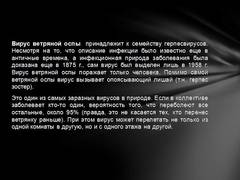 Слайд 5 Вирус ветряной оспы принадлежит к семейству герпесвирусов. Несмотря на то, что описание инфекции было известно еще в античные времена, а инфекционная природа заболевания была доказана еще в 1875 г., сам вирус был выделен лишь в 1958 г. Вирус ветряной оспы поражает только человека, Помимо самой ветряной оспы вирус вызывает опоясывающий лишай (т.н. герпес зостер). Это один из самых заразных вирусов в природе. Если в коллективе заболевает кто-то один, вероятность того, что переболеют все остальные, около 95% (правда, это не касается тех, кто перенес ветрянку раньше). При этом вирус может перелетать не только из одной комнаты в другую, но и с одного этажа на другой.