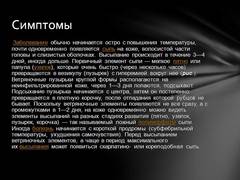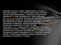 Слайд 10 Различают типичные (легкая, среднетяжелая и тяжелая) и атипичные формы В. о. При легкой форме общее состояние больного удовлетворительное. Температура иногда бывает нормальной, но чаще субфебрильной, редко превышает 38°. Высыпания на коже не обильные, на слизистых оболочках — в виде единичных элементов. Длительность высыпания 2—4 дня. Для среднетяжелой формы характерны небольшая интоксикация, повышенная температура, довольно обильные высыпания и зуд. Длительность высыпания 4—5 дней. По мере подсыхания везикул нормализуется температура и улучшается самочувствие ребенка. Тяжелая форма характеризуется обильной сыпью на коже и слизистых оболочках рта, глаз, половых органов. Температура высокая, наблюдаются рвота, отсутствие аппетита, плохойсон, беспокойство ребенка в связи с сильным зудом. Длительность высыпания 7—9 дней.