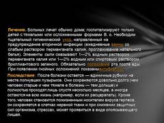 Слайд 12 Лечение. Больных лечат обычно дома; госпитализируют только детей с тяжелыми или осложненными формами В. о. Необходим тщательный гигиенический уход, направленный на предупреждение вторичной инфекции (ежедневные ванны со слабым раствором перманганата калия, проглаживание нательного белья). Элементы сыпи смазывают 1—2% водным раствором перманганата калия или 1—2% водным или спиртовым раствором бриллиантового зеленого. Обязательно полоскание рта после еды. При появлении гнойных осложнений показаныантибиотики. Последствия: После болезни остается — единичные рубчики на месте лопнувших пузырьков. Они сохраняются довольно долго (чем человек старше и чем тяжеле е болезнь — тем дольше) и полностью проходят лишь спустя несколько месяцев, а иногда остаются на всю жизнь (например, если их расцарапать). Кроме того, человек становится пожизненным носителем вируса герпеса, он сохраняется в клетках нервной ткани и при снижении защитных сил организма, стрессах, может проявиться в виде опоясывающего лишая.