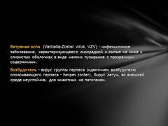 Слайд 3 Ветряная оспа (Varicella-Zostervirus, VZV) – инфекционное заболевание, характеризующееся лихорадкой и сыпью на коже и слизистых оболочках в виде мелких пузырьков с прозрачным содержимым. Возбудитель – вирус группы герпеса (идентичен возбудителю опоясывающего герпеса – herpeszoster). Вирус летуч, во внешней среде неустойчив, для животных не патогенен.