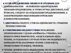 Слайд 18 6. Если предложение является трудным для понимания или осложнено однородными членами предложения, в этом случае диктовать, как и писать, следует не отдельными предложениями, а законченными смысловыми отрезками (словосочетаниями). 7. Диктовать следует, стоя на одном месте, громким чётким голосом 8. Совершенно недопустимо искажение произношения с целью «поймать» ученика, как равно и орфографическое, «подсказываю-щее» чтение, в отдельных случаях резко расходящееся с нормами речи (например, чтение слов ко[го], твое[го] вместо ко[во], твое/во]). 9. Чтение должно быть медленным, но не настолько, чтобы терялась или разрывалась мысль, выраженная данным предложением. Необходимо обеспечить возможность всем учащимся успевать записывать диктуемый текст, для чего необходимо соблюдать ровный темп чтения. Учитель должен выбрать одного, не очень торопливого ученика и, следя за темпом его письма, ориентироваться в чтении на него.