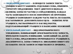 Слайд 14 Свободный диктант — в процессе записи текста учащиеся могут заменить отдельные слова, изменить структуру предложения. Текст диктуется вначале целиком, затем по частям (3-4 предложения); каждая часть записывается после повторного её прочтения. Учащиеся записывают каждую часть текста по памяти, как запомнили. Дополнительная цель — развитие речи учащихся, рассматривается как вид работы, подготавливающий учащихся к написанию изложений. Зрительный диктант — вид орфографического упражнения, развивающий орфографическую зоркость, зрительную память и внимание. Записанный на доске текст (слова, предложения) прочитывается учащимися, анализируется, затем стирается. Школьники пишут его по памяти. После записи осуществляется проверка.