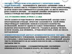 Слайд 11 Письмо с пропуском букв (диктант с пропущенными орфограммами)— разновидность диктанта «Проверяю себя». В процессе записи текста учащиеся пропускают буквы (орфограммы), если не знают или сомневаются в написании. На месте пропуска букв ставится прочерк— по нижней линейке проводится черта. Запись в тетради выглядит следующим образом: В л_суслышна звонк_я трель с_л_вья. После записи осуществляется орфографический анализ слов с пропущенными буквами. Пропуски заполняются. Такой приём предупреждает появление ошибок и большого количества исправлений, является одним из самых эффективных приёмов развития орфографической зоркости. Учащиеся должны уяснить: если не знаешь, как проверить, лучше пропустить букву, но писать наугад нельзя! Комментированный диктант (комментированное письмо) — вид орфографического упражнения, разновидность слухового диктанта в сочетании с орфографическим разбором. Орфографический анализ текста производится не до записи или после неё, а совмещается с письмом текста. Обязательное условие — к комментированию поочерёдно привлекаются все учащиеся класса, не только сильные.