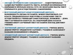 Слайд 15 Письмо по памяти или самодиктант— самостоятельная запись выученного наизусть текста, который воспринимается учащимися зрительно или на слух. По окончании работы текст открывается для осуществления самопроверки. Разученный диктант (подготовленный диктант) — разновидность письма по памяти, можно практиковать в IV классе. Предварительная подготовка к написанию текста осуществляется учениками самостоятельно, возможно — дома. Текст заучивается наизусть. На следующий день в классе ученики пишут заученный текст по памяти или под диктовку учителя. Картинный диктант (беззвучный диктант) -учитель молча демонстрирует предметную картинку, учащиеся записывают название изображённого предмета. Предметный диктант (беззвучный диктант) -учитель молча демонстрирует предмет, учащиеся записывают название предмета.