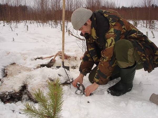 Ловля лисы с помощью охотничьего капкана считается предпочтительной для тех, кто хочет получить шкурку высокого качества. Дело в том, что при использовании данного метода мех практически не повреждается. Как правило, для этой цели используются небольшие следовые капканы №2, 3 или 5 (рисунок 7).