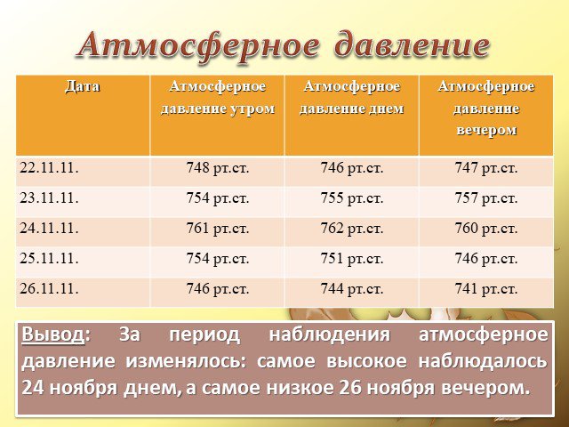 Вывод: За период наблюдения атмосферное давление изменялось: самое высокое наблюдалось 24 ноября днем, а самое низкое 26 ноября вечером.