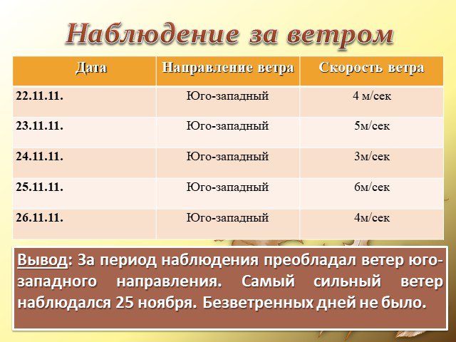 Вывод: За период наблюдения преобладал ветер юго-западного направления. Самый сильный ветер наблюдался 25 ноября. Безветренных дней не было.