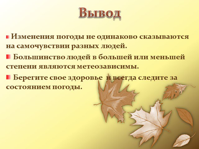 Изменения погоды не одинаково сказываются на самочувствии разных людей. Большинство людей в большей или меньшей степени являются метеозависимы. Берегите свое здоровье и всегда следите за состоянием погоды.
