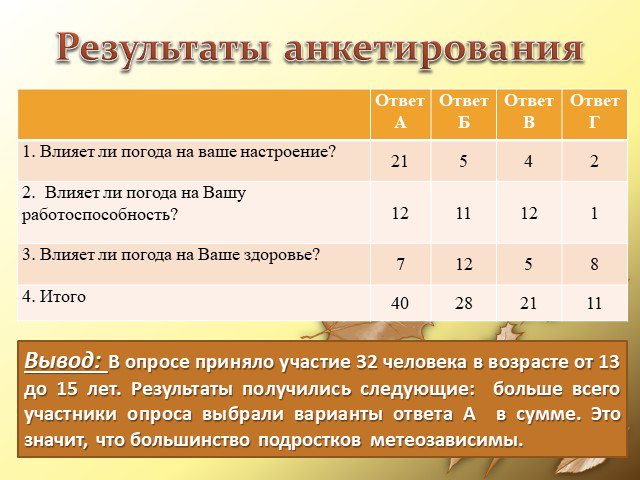 Вывод: В опросе приняло участие 32 человека в возрасте от 13 до 15 лет. Результаты получились следующие: больше всего участники опроса выбрали варианты ответа А в сумме. Это значит, что большинство подростков метеозависимы.