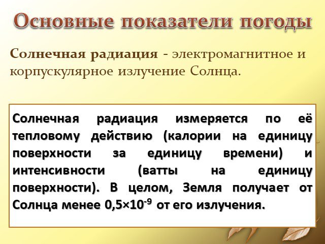 Солнечная радиация измеряется по её тепловому действию (калории на единицу поверхности за единицу времени) и интенсивности (ватты на единицу поверхности). В целом, Земля получает от Солнца менее 0,5×10-9 от его излучения.