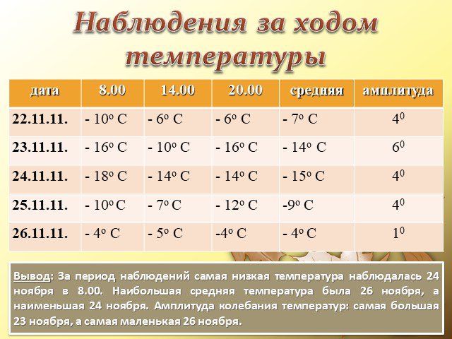 Вывод: За период наблюдений самая низкая температура наблюдалась 24 ноября в 8.00. Наибольшая средняя температура была 26 ноября, а наименьшая 24 ноября. Амплитуда колебания температур: самая большая 23 ноября, а самая маленькая 26 ноября.