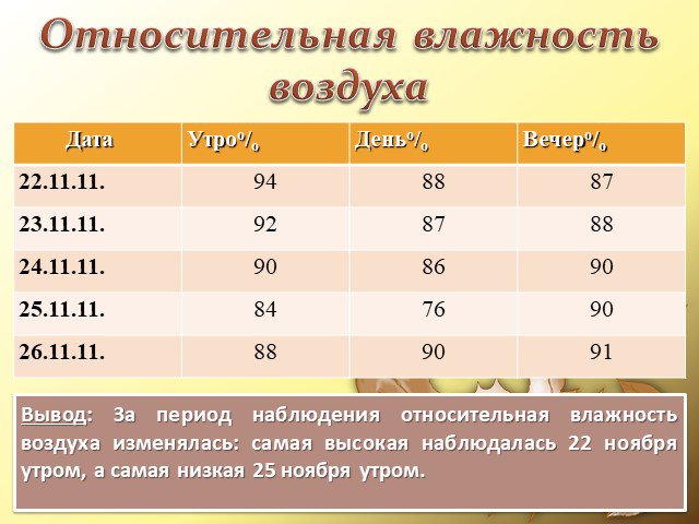 Вывод: За период наблюдения относительная влажность воздуха изменялась: самая высокая наблюдалась 22 ноября утром, а самая низкая 25 ноября утром.