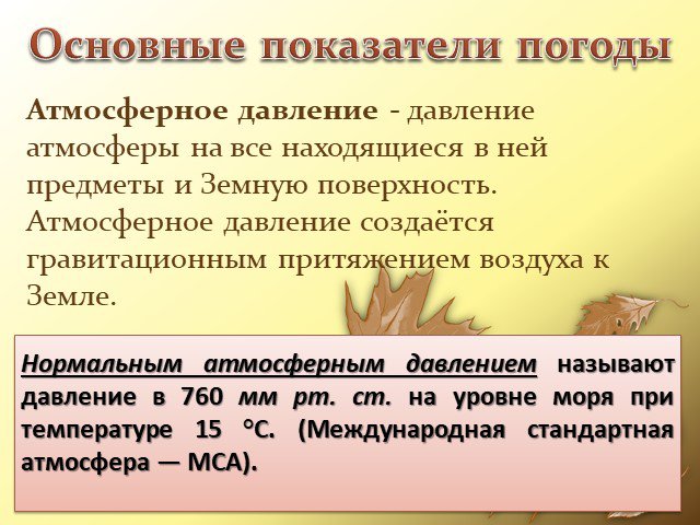 Атмосферное давление - давление атмосферы на все находящиеся в ней предметы и Земную поверхность. Атмосферное давление создаётся гравитационным притяжением воздуха к Земле.