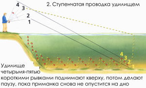 Ступенчатую проводку выполняют равномерно с небольшими паузами отрывая приманку от дна не более чем на 10 см.