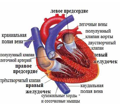 Сердце представляет собой полый мышечный орган сердце, строение сердца состоящий из двух предсердий и двух желудочков. В левой стороне сердца течёт артериальная кровь, а в правой - венозная. Благодаря ритмическим сокращениям сердца, кровь продвигается по сосудам и циркулирует по всему организму.