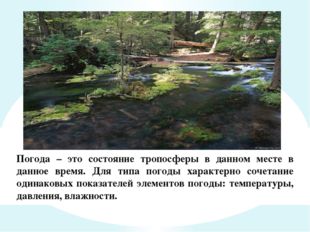 Погода – это состояние тропосферы в данном месте в данное время. Для типа погоды характерно сочетание одинаковых показателей элементов погоды: температуры, давления, влажности.