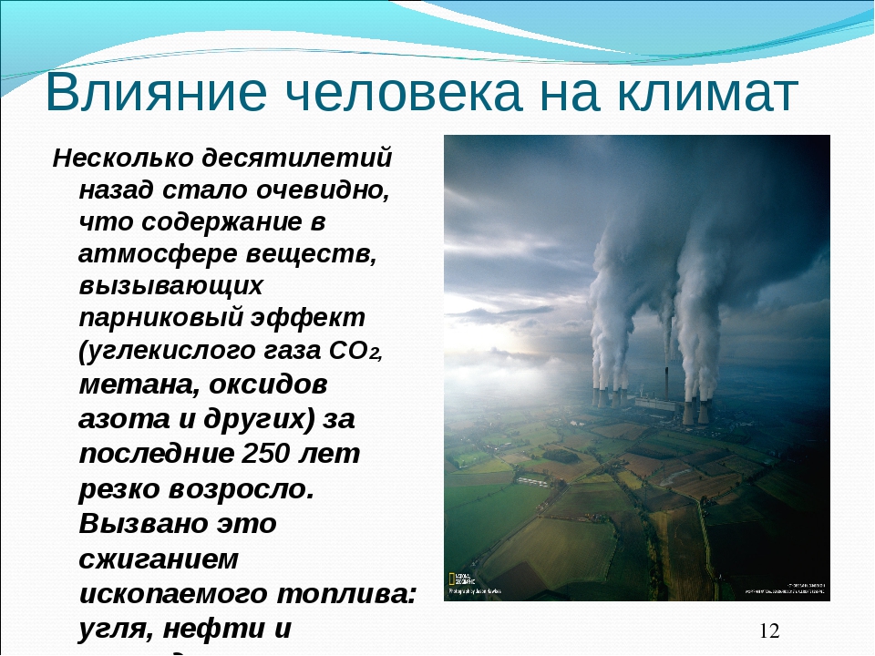 Мы рассмотрели, как климат влияет на жизнь людей. Но существует и обратный процесс: влияние человека на климат. Хозяйственная деятельность человека является причиной потепления, вызывает смягчение погодных условий. Замечено, что в городах температура немного выше, чем за городом. Потепление происходит из-за следующих причин: