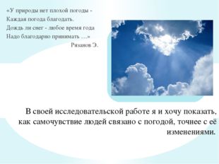 «У природы нет плохой погоды - Каждая погода благодать. Дождь ли снег - любое время года Надо благодарно принимать …» Рязанов Э. В своей исследовательской работе я и хочу показать, как самочувствие людей связано с погодой, точнее с её изменениями.
