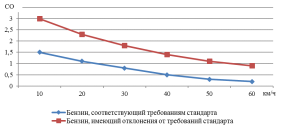 Рис. 1. Влияние качества топлива и скорости движения автомобиля на выбросы СО.