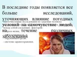 В последние годы появляется все больше исследований, уточняющих влияние погодных условий на самочувствие людей, на течение различных заболеваний. Многочисленные исследования по здоровью человека показывают, что здоровье зависит от сочетания и взаимосвязи между собой следующих факторов: - образа жизни, - наследственности, - окружающей среды, - системы здравоохранения.