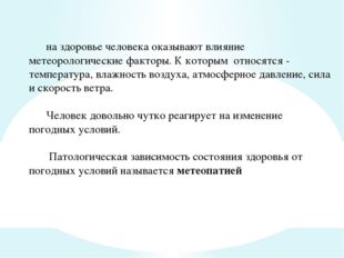 на здоровье человека оказывают влияние метеорологические факторы. К которым относятся - температура, влажность воздуха, атмосферное давление, сила и скорость ветра. Человек довольно чутко реагирует на изменение погодных условий. Патологическая зависимость состояния здоровья от погодных условий называется метеопатией