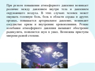 При резком повышении атмосферного давления возникает различие между давлением внутри тела и давлением окружающего воздуха. В этих случаях человек может ощущать головную боль, боль в области сердца и других органах, повышается артериальное давление, возникают сосудистые кризы и внутренние кровоизлияния. Резкие колебания атмосферного давления вызывают обострение радикулита, появляется шум в ушах. Возможны приступы мигрени разной степени.