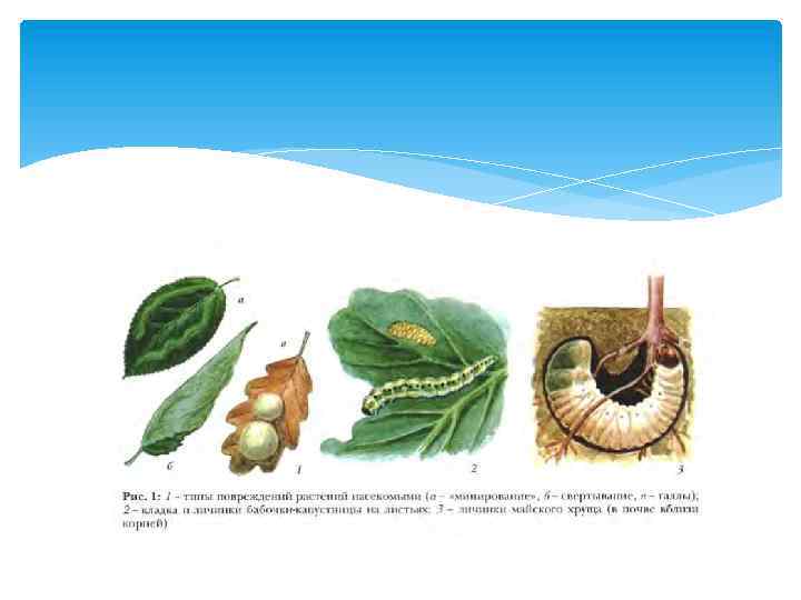 Рис. 1: 1 - типы повреждений растений насекомыми (а - «минирование», б- свертывание, в - галлы); 2 - кладка и личинки бабочки-капустницы на листьях; 3 - личинки майского хруща (в почве вблизи корней).