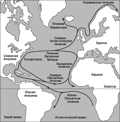 Здесь, конечно же, нельзя не упомянуть Гольфстрим. Но и другие проходящие через Атлантический океан течения оказывают на климат близлежащих территорий немаловажное влияние. У Зеленого Мыса (Африка) рождается северо-восточный пассат. Он гонит огромные прогревшиеся массы воды на запад. Пересекая Атлантический океан, они соединяются с Антильским и Гвианским течениями. Эта усиленная струя движется к Карибскому морю. После этого воды устремляются на север. Это непрерывное движение по часовой стрелке называется теплым Североатлантическим течением. Край его у высоких широт неопределенный, размытый, а у экватора - более четкий.