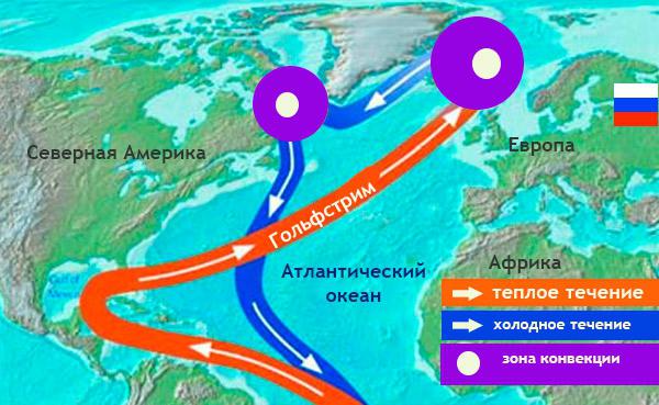 Говоря о влиянии Гольфстрима на климат Европы, надо иметь в виду два важных момента. Во-первых, под Гольфстримом в данном случае необходимо понимать всю систему теплых североатлантических течений, а не собственно течение Гольфстрим (оно североамериканское и к Европе никакого отношения не имеет). Во-вторых, помнить о поступлении тепла и влаги с поверхности всего Атлантического океана посредством их переноса воздушными массами. Одного теплого океанского течения для обогрева всей Европы явно мало.