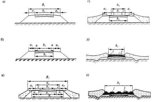 Схему а) принимают за расчетную для дорог I и II категорий с обочинами, укрепленными на всю ширину каменными материалами с применением минеральных или органических вяжущих. Схема б) относится к дорогам или участкам с укрепленными краевыми полосами и неукрепленными обочинами или имеющим обочины, укрепленные щебеночными и гравийными материалами без вяжущих. Схема в) относится к дорогам без укрепленных краевых полос и обочин.