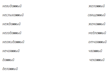 Кроме этого, есть несколько слов с двумя буквами Н, написание которых необходимо выучить точно так же, как мы запоминаем слова-исключения: НЕВИДАННЫЙ, НЕСЛЫХАННЫЙ, НЕЖДАННЫЙ, НЕГАДАННЫЙ, НЕЧАЯННЫЙ, ЖЕЛАННЫЙ, ЖЕМАННЫЙ, СВЯЩЕННЫЙ, ЧВАННЫЙ.