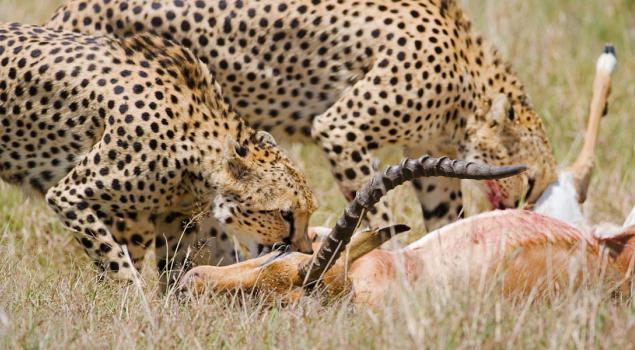 Как только утомлённый гоном добычи гепард завершает охоту, он немедленно приступает к пополнению сил. Это дикое животное так же чистоплотно, как гордая птица орёл. Никогда эти двое не прикоснутся к падали, скорее от голода умрут. Дичь они употребляют в пищу только самую свежую. Гепард, например, немедленно съедает внутренности добытого зверя и пьёт его ещё тёплую кровь, восстанавливая свои потерянные при быстром беге силы.