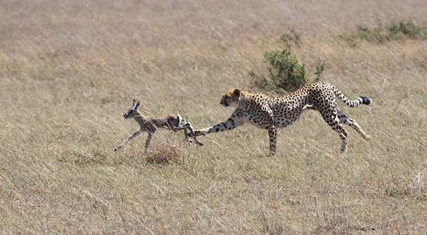 Гепард – прирожденный хищник. В погоне за жертвой он развивает скорость до 120 км/ч. Его хвост во время бега помогает ему балансировать, а когти служат своего рода шиповками, которые дают возможность повторять все зигзаги за бегущей жертвой. Глаза позволяют увидеть любое движение на большом расстоянии. Настигая добычу, гепард подсекает ее лапой, а затем старается вцепиться в шею.