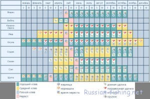 Здесь в таблице наглядно показано лучшее время для ловли рыбы (бычок, голавль, густера, жерех, карась, красноперка, лещ, линь, налим, окунь, пескарь, плотва, подуст, рыбец, сазан, сом, судак, чехонь, щука, язь) по месяцам.
