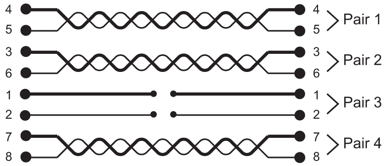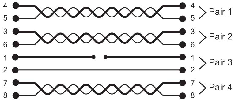 Расщепленная пара (Split pair) - это серьезная ошибка монтажа, при которой провода из двух разных пар объединены в «рабочую» пару по ошибке (провода не скручены между собой). Эта неисправность возникает, когда монтажник одинаково путает цветовую последовательность проводов в коннекторе на обоих концах кабеля. Передача данных, как и раньше, будет осуществляться по двум проводникам, но они уже не будут находятся в скрутке между собой.