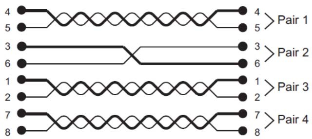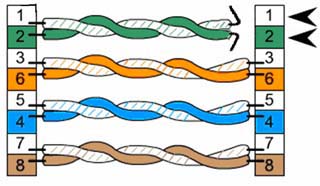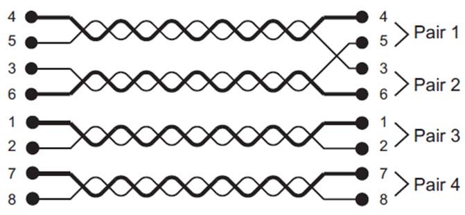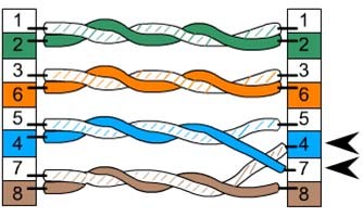 Ошибка монтажа витой пары "перекрещенные провода" возникает когда монтажник, обжав правильно коннектор на одной стороне кабеля, поменял местами провода из разных пар на другом конце. Проблема легко выявляется даже простыми тестерами. Решается повторной, более внимательной оппрессовкой разъёма с соблюдением правильной схемы обжима.