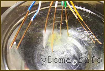 В небольшую емкость из диэлектрического материала (стекло, пластик, полиэтиленовый пакет) налить немного воды с растворенной в ней поваренной солью из расчета четверть объема соли от объема воды. Чем соли больше, тем лучше. Соль добавляется в воду, чтобы уменьшить ее электрическое сопротивление. Погрузить все проводники одного конца кабеля в емкость с раствором. Можно погружать каждую витую пару и по очереди. Расстояние между проводниками витых пар должно быть минимальным, но соприкасаться они не должны.
